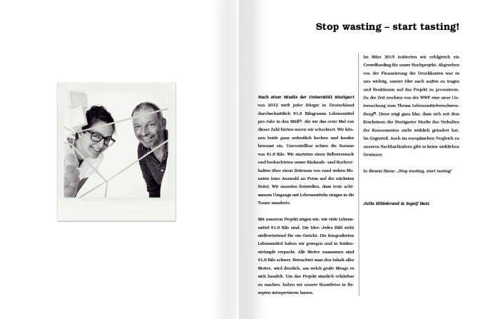 Dem Buch liegt eine Studie zugrunde, wonach der Bundesbürger pro Jahr 81,6 kg Lebensmittel wegschmeißt. Diese Menge wurde in 30 kunstvoll-ästhetischen Foto-Motiven vom Fotografenpaar visualisiert und in Rezepten von Chefkoch Maik Oehlke aus dem Herrenhaus interpretiert. Gedruckt und verlegt wird das knapp 200 Seiten starke Werk von Edition Longo in Bozen, finanziert wurde es zum großen Teil von der Crowd.